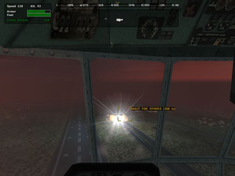 | Firing salvos of 57mm rockets as I swoop low over an enemy airfield in a Mi-8 Hip helicopter. The bright flash is from an AH-1 Cobra freshly destroyed by my accurate rocketry. |